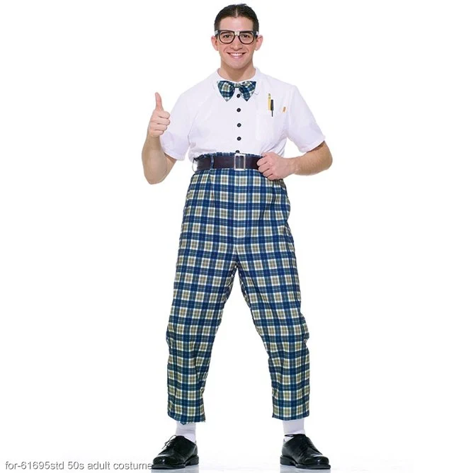 You better hurry up and clean your plastic pocket protector and bleach your socks because school’s in session! This Adult 50’s Class Nerd Costume includes a one piece jumpsuit featuring high-water bottoms, a white button-up top, an attached bowtie, and a black belt. Glasses with tape and plastic pocket protector are sold separately.