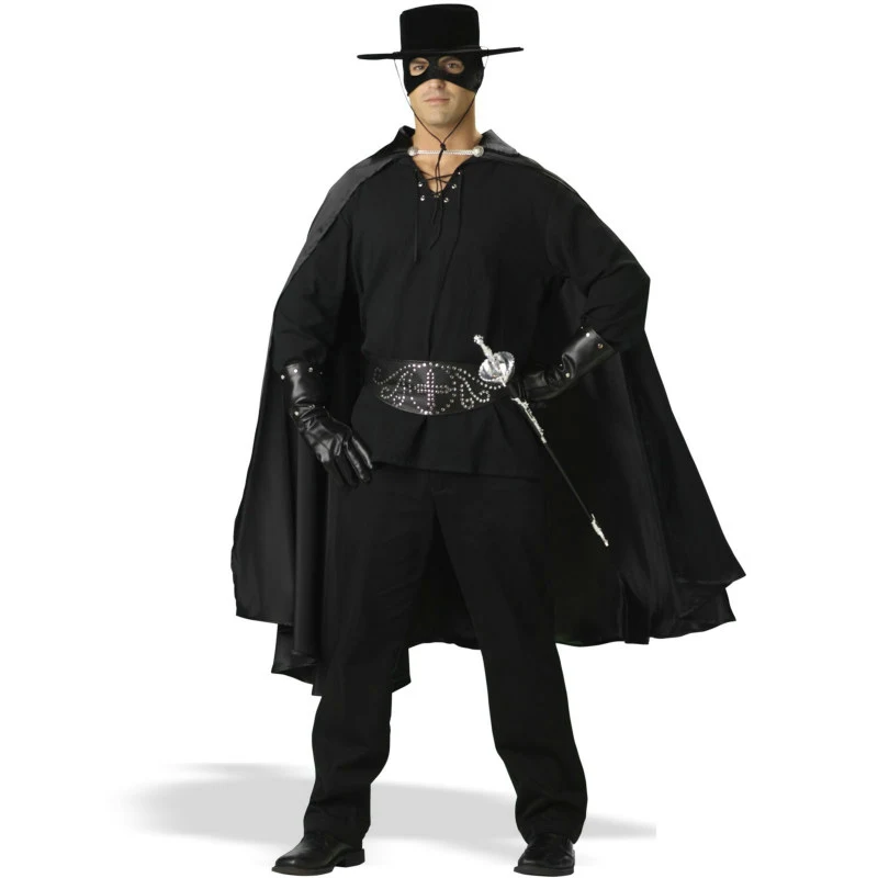 This excellent costume includes a black gauze shirt, black satin cape with silver front closure, studded belt, studded gloves, hat, eye mask, and toy fencing sword. Bring a bit of dashing darkness and mystery in to your evening!!