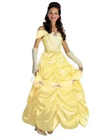 Elegant & Lovely!The Bell costume includes: An elegant, off the shoulder, long yellow gown with sheer overlay, pink rosette accents, Belle character cameo and a pair of glovettes. Available size: