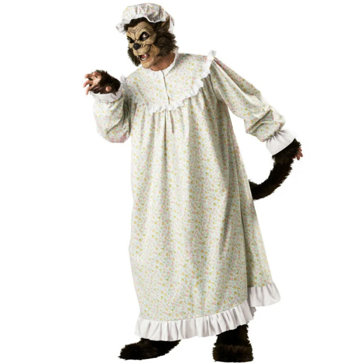 This premier quality, fully finished garment includes a floral print flannel granny nightgown with attached tail, matching nightcap, plush faux fur shoe covers, and plush faux fur fingerless gloves. A vinyl and plush chinless face mask* is also included. Pair this great costume with Little Red Riding Hood for a classic couples costume.