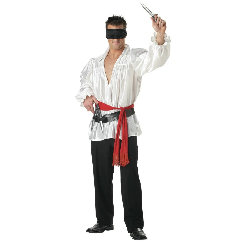 The Billy Bulls Eye costume includes: white shirt, red sash with fringe, vinyl knife belt, knives, and black see through blind fold.