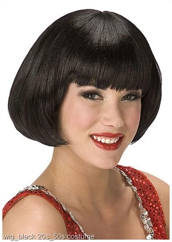 Short, black, flapper style hair.This stylish flapper wig will give you the signature bobbed look of the roaring 20’s. The black wig has short, delicate bangs, which waves in front of your forehead while the rest of the hair cusps around your neck. The wig gives off a glistening glow and is comfortable to wear, making it the perfect addition to your flapper costume.