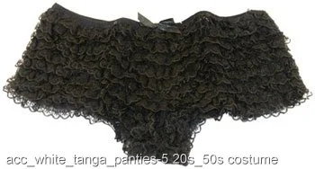 Black Ruffle Tanga PantiesAdd an extra layer of sexiness to your costume with these black ruffle tanga panties. The micromesh short shorts have many rows of tiny, decorative lace and a matching black bow is in the center of the waistband. The actual waistband is elastic and has a lot of stretch, creating adjustability for a comfortable fit. The greatest part about these tanga panties is that they can be worn with any outfit! Boost your costume’s sex appeal with these black ruffle panties.