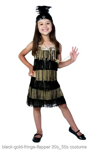 Black and Gold Fringe DressMatching Feather HeadbandGet this child gold and black flapper costume for a 1920s themed event or Halloween! This girls flapper dress has a glossy, gold material underneath six rows of fringe, which alternate between solid black and gold with black. The shoulder straps and neckline is covered in sparkling gold sequins and the matching headband is covered in gold sequins as well. The headband also has a large black feather and a clear jewel accent in the front. Your child will look just like a jazz time honey in this exclusive 1920s costume!