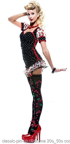 Dress w/attached BoleroBe as sassy as Bettie Page in this classic pin up girl costume! The fun and flirty costume includes a black dress with a sweetheart top and is made from a nylon and spandex blend. It features a bolero attached underneath the arms with an opening between the bolero and the dress in the back. The entire dress is covered in white polka dots and lined with red trim. The sleeves as well as the bottom hemline feature a white mesh material with red and green cherries printed on it. It ties on both sides with red ribbon which can also be used to shorten the dress’ length. Complete your look with our blonde ponytail wig and red beaded necklace!