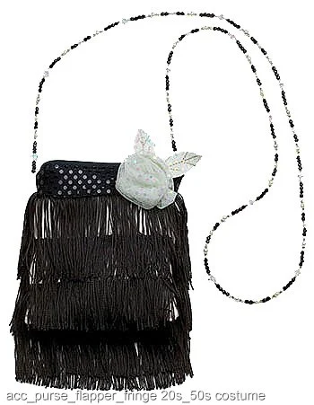 White satin purse with three layers of black fringe and a layer of sequins along the top.This classic and unique handbag is a great accessory to any 20’s flapper or gangster costume. This purse is made with white satin and has three layers of black fringe. Black spangles line the top of the bag and the strap is alternating sections of white, black and gold beads. The strap reaches 22″. Pinned to the top corner of the purse is a beautiful white cloth flower with white sequin. This fringe purse is practical and fun for any night out in the town.