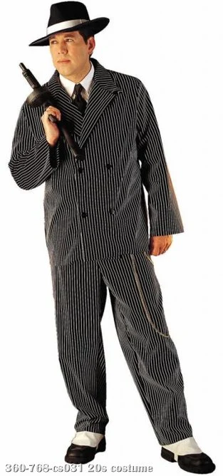 Move Over Al Capone…Here’s A Real Gangster. Costume includes: Double breasted suit coat with notched collar and functional buttons. Tapered trousers with elastic waistband. Available sizes: