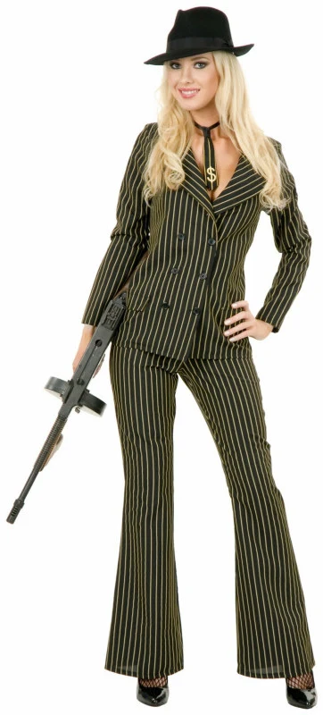 Show ’em who’s boss as this killer cutie! This luscious and luxurious look includes a black and pearly white pin-striped double breasted gangster jacket with matching ring zip pants. A titillating tie with gleaming gold dollar sign is also included in this gorgeous gangster’s style. Put on this suave sweetie’s ensemble, and you’ll be sure to knock ’em dead.