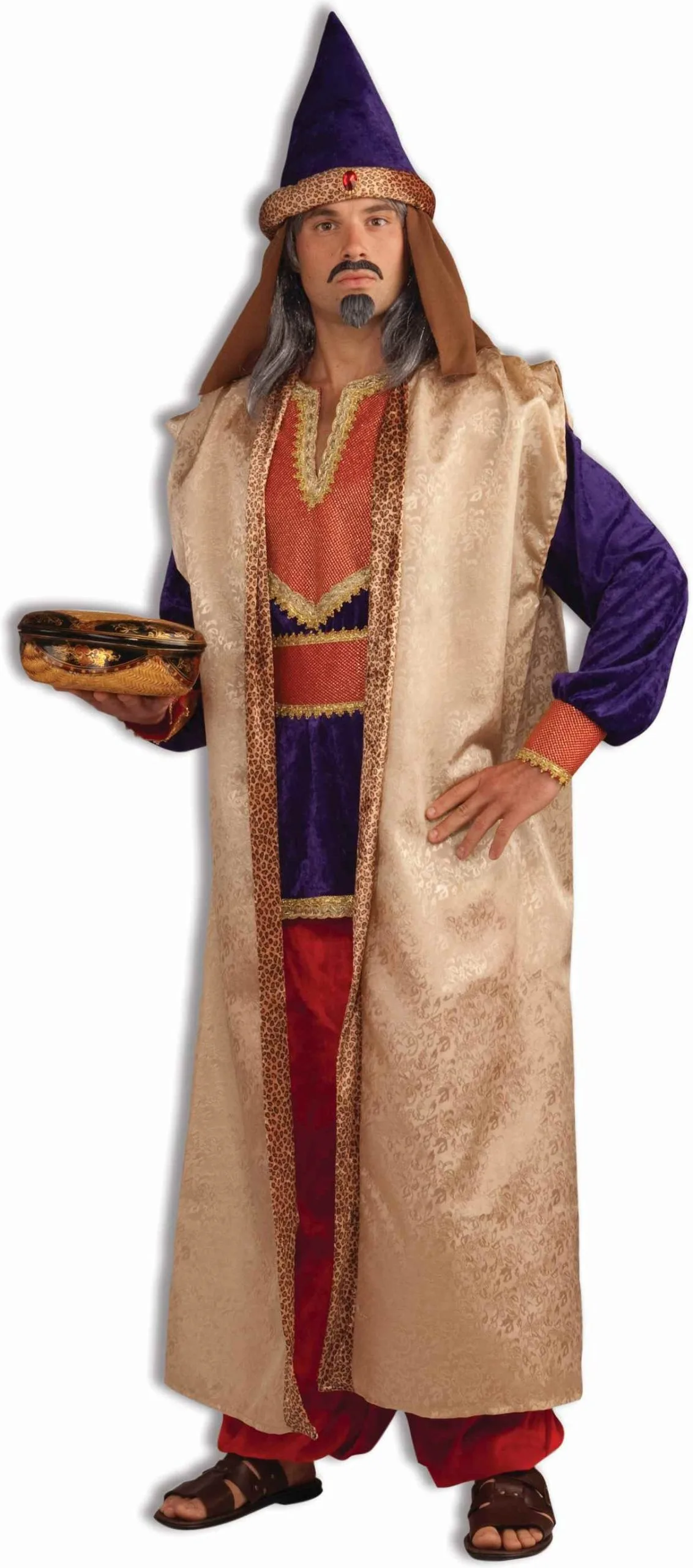 Travel the sandy desert with gifts in arm for the newborn king this Holiday! This great ensemble includes a two tone tunic style top, a pair of pants, a belt, a long gold cape, and a cone shape headpiece.