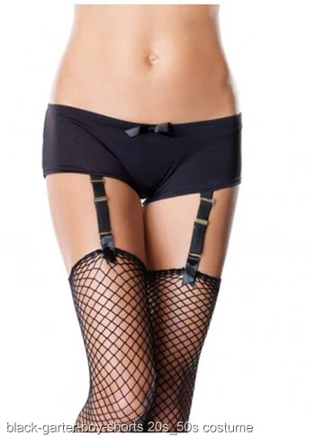 Black Boy Shorts w/attached GartersAdd sex appeal to your Halloween costume with these garter boy shorts! The black shorts are made from a polyester and spandex blend with an elastic waistband for a comfortable fit. A black bow sits at the top for a feminine touch and the elastic garters are perfect for holding up a pair of sexy fishnet stockings. A sultry accessory for Halloween and beyond!