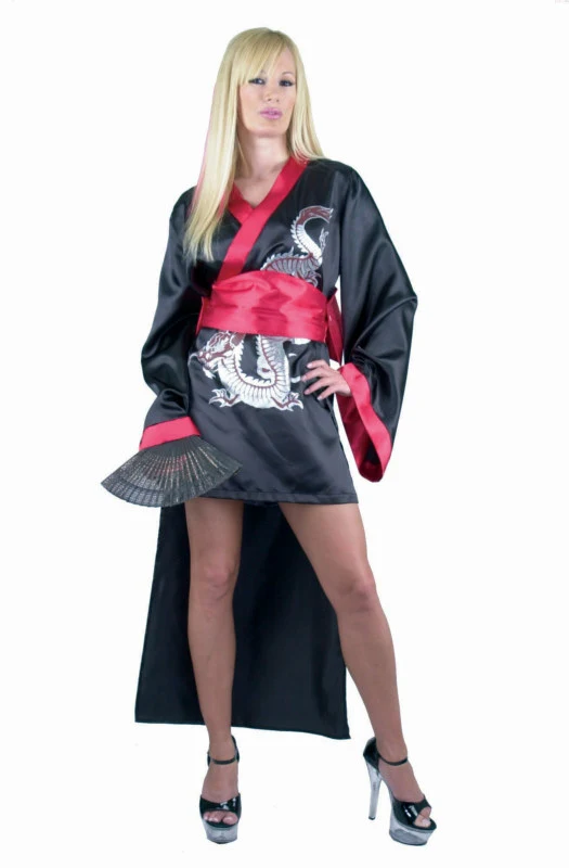 Wise in the ways of beauty and grace, the Geisha Girl will take center-stage at your next Halloween party. The costume includes a black satin kimono-style dress with silver dragon detail and crimson satin trim. A matching obi is also included to tie this look together.