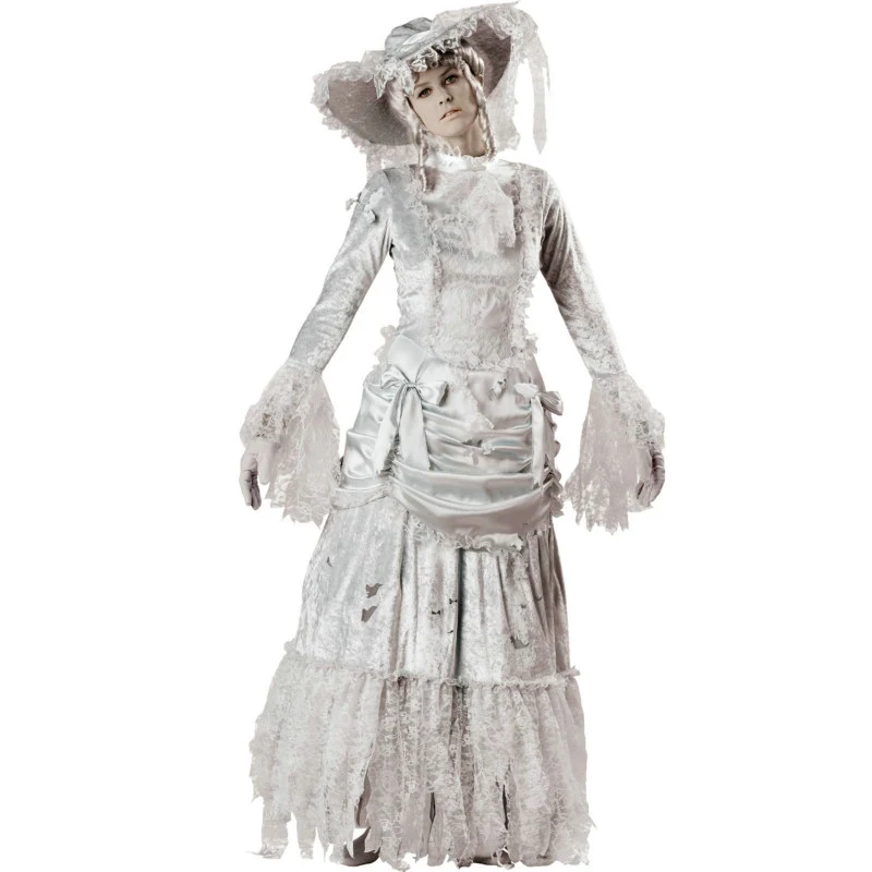 This lovely, fully finished garment includes a light grey tattered full length velvet gown with zipper in back, satin & lace accents, tulle petticoat, matching hat, gloves, and wig. Pair with the Ghostly Gent for a spine-chilling couples costume.