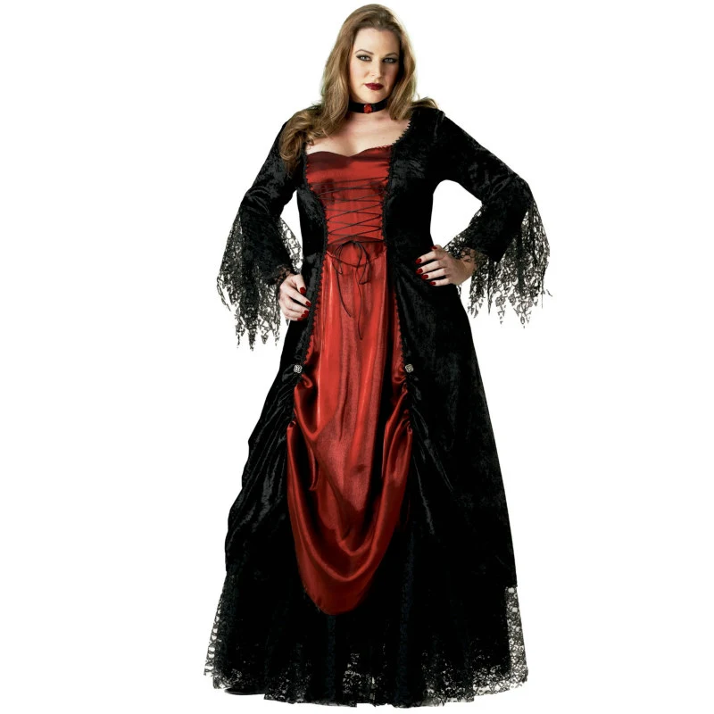 This formal, fully finished garment includes: flowing full length lace trimmed black crushed panné and deep red shimmer satin gown trimmed with black loop braid and antique silver gothic buttons with zipper in back. Also includes jeweled velvet choker and tulle and lace full petticoat.