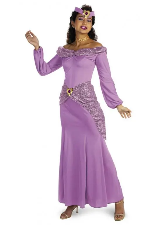 The Jasmine prestige costume includes: Thelong regal purple gown with iridescent skirt drape, simulated jewel choker and matching headpiece.Available size: