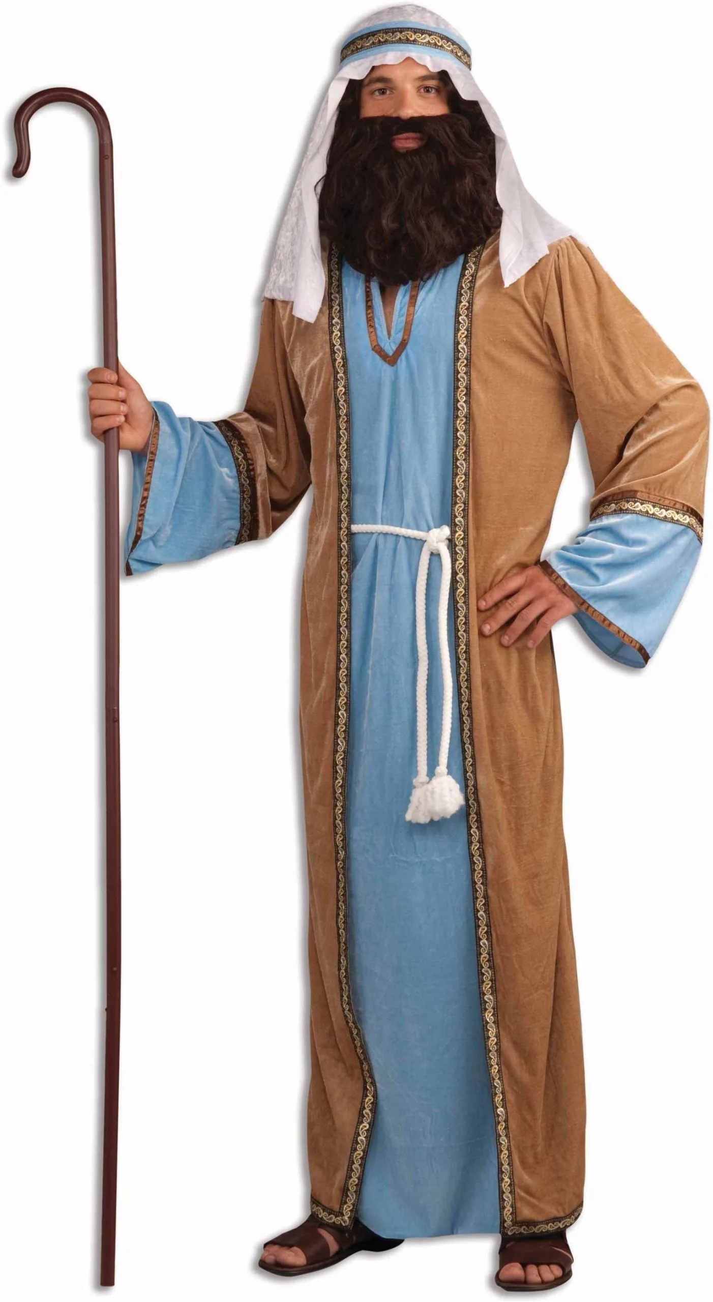 Perfect for Holiday plays! This great ensemble includes long brown coat with an attached blue tunic style robe, a white cloth headpiece, and a rope style belt.