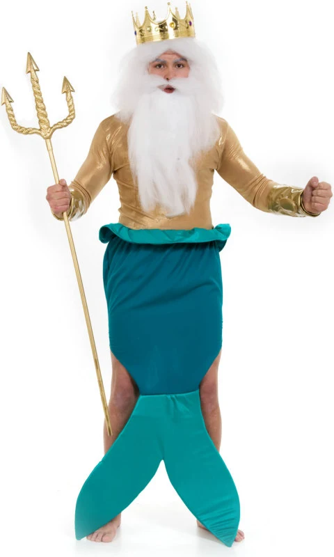 As this ruler of the ocean, you’ll be entertained by beautiful mermaids and waited on by your loyal subjects. Costume features a gold shirt, arm cuffs, turquoise mermaid fin skort with green trim and flipper, and matching crown. Also includes long white wig and beard.
