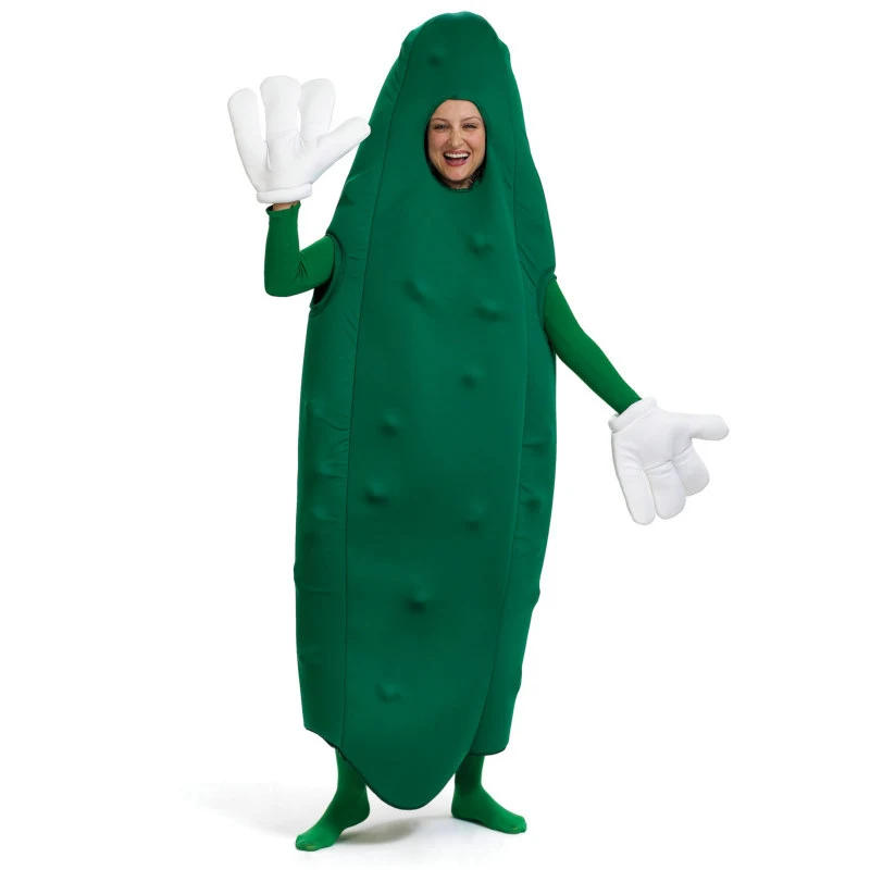 This Pickle adult costume is a one piece full body costume with face cutout.