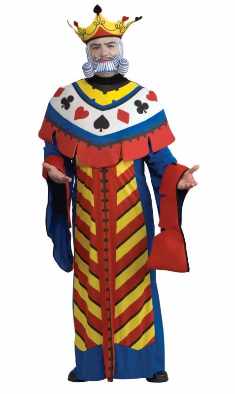 This unique design is no slight of hand. You will shuffle into your next costume party and rule the room! The Playing Card King costume features a vibrant, primary-colored robe with bell sleeves and velvet collar. The attached capelet features spades, hearts, diamonds and clubs to prove that this king is playing with a full deck! A matching headpiece is also included to make you feel like royalty during a rousing match of Kings in the Corner!