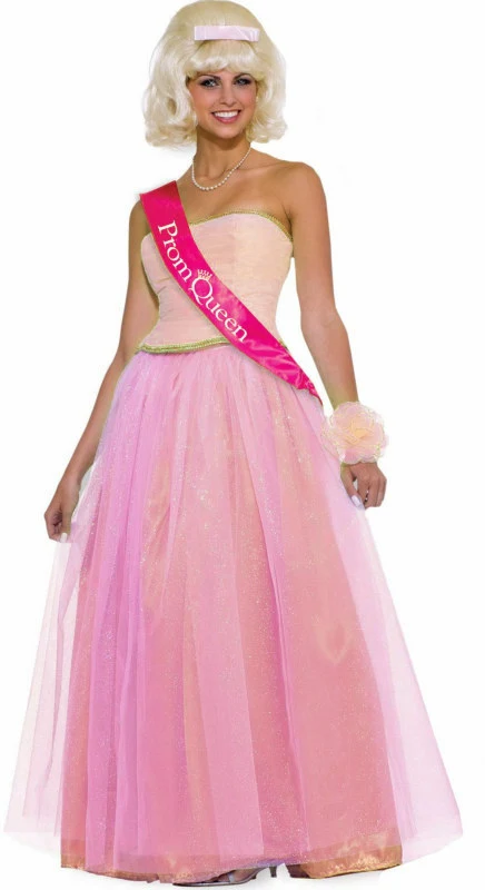 Be cast as retro-revived teen royalty! The Prom Queen costume includes: A pink strapless top with gold trim, a pink and purple iridescent skirt, a “Prom Queen” sash, and a matching wrist corsage.