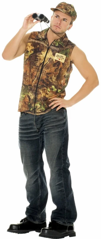 Go incognito as you’re on the hunt in this camouflage costume, which includes a zip-up sleeveless shirt with “Big Buck Hunting Club” patch and matching camo-cap. Get bold, go big or go home.