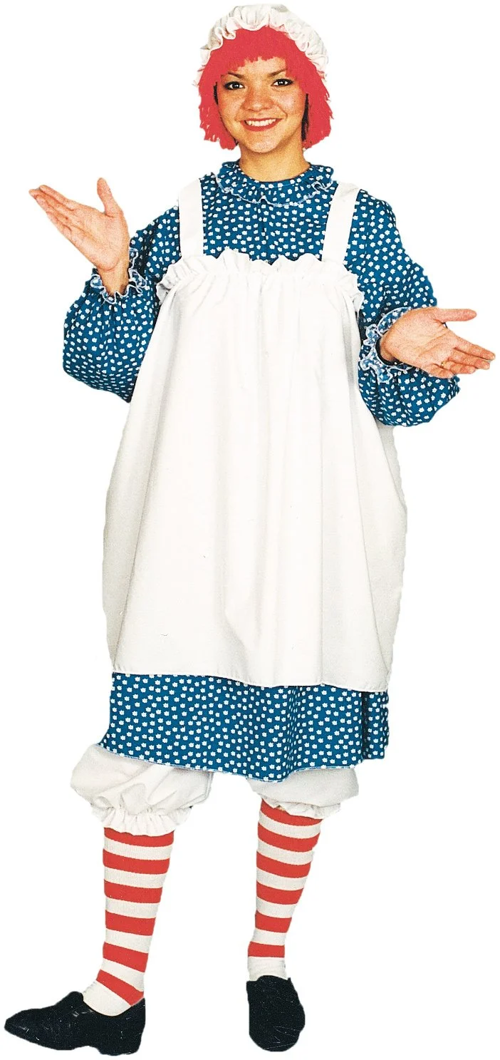 Our Raggedy Ann Adult Costume includes a one piece blue with white polk-a-dot dress and white apron, white bloomers, red and white striped stockings and a one piece hat and wig.
