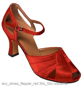 Red satin exteriorOpen-toeSilver buckle for easy adjustmentWalk into the hearts of everyone with these sleek and sexy red, open-toed flapper shoes. These red satin heels have a contemporary cross pattern in front while still maintaining the classic flapper feel. A silver buckle gives three adjustable settings to fit your comfort. In addition, the bottom of the shoe is lined with rubber to prevent slipping. These shoes are fabulous for any night out.