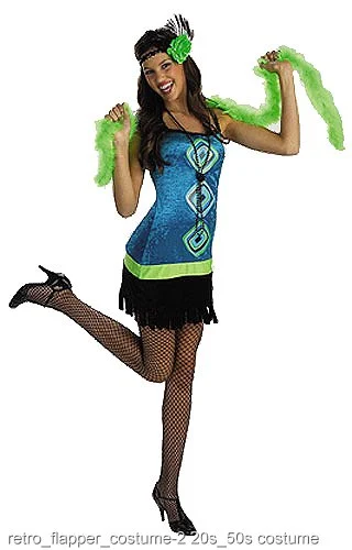 DressMarabou boaHeadpieceBlack necklaceThe distinctive teen retro flapper costume combines the style of the psychedelic 60’s with the 20’s sense of jazzy glamour. The top of the dress has vibrant, exciting designs printed in front. The dress is made from velvet, but also has black sequin straps and fringe on the bottom. In addition, the costume comes with a black beaded headpiece that has a glittery, lime green feathered boa and a black pearl necklace; each item puts a new and interesting spin on the flapper costume.