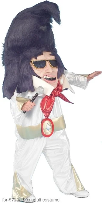 This adult Elvis costume is an oversized parade pleaser. You are sure to bring in the laughs and smiles with this adult oversized Elvis parade costume. This adult costume includes oversized headpiece with hair, chest piece with face and hair, and jumpsuit. He traditional Elvis jumpsuit identifies this character along with the stylish rocker hair. Your face sits up inside the top of the hair-do for easy viewing and a realistic appearance.