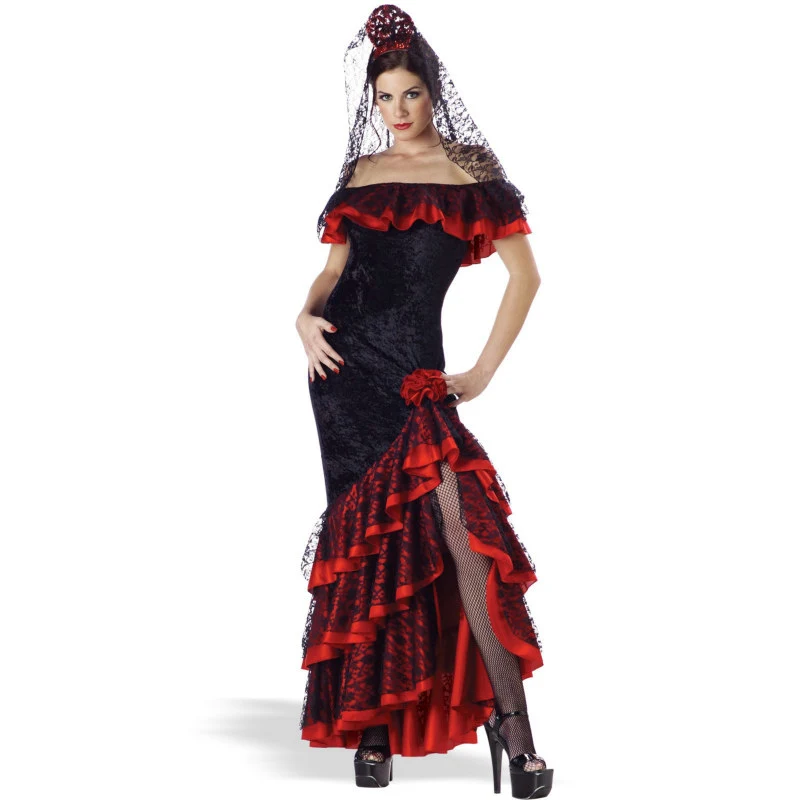 This sophisticated costume includes a black panne velvet gown with layered red satin and black lace ruffles, sequin headpiece with black lace mantilla veil and fishnet pantyhose. Pair with Bandido for a mysterious and exotic couples costume!