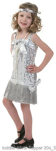 Silver Sequin and Fringe Flapper DressBeaded NecklaceSilver Sequin HeadbandThis toddler flapper costume will be stunning gangsters everywhere! The sassy silver costume dress for kids has a sequin coated dress with a metallic band across the chest and another around the hips. Matching bows on each band and fringe across the bottom of the dress add detail to this toddler costume. A long pearl necklace and sequin elastic headband complete this girls flapper costume dress. Head out on Halloween with this doll by your side!