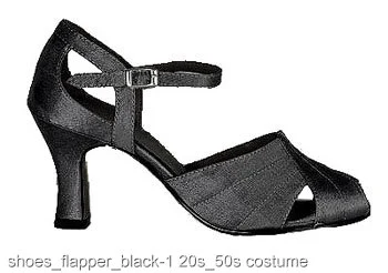 Pair of Black Flapper ShoesThese size small womens flapper shoes are the perfect complement toany of our womens costumes. These black satin heels have a contemporary cross pattern in front while still maintaining the classic flapper feel. A silver buckle gives three adjustable settings to fit your comfort. In addition, the bottom of the shoe is lined with rubber to prevent slipping.